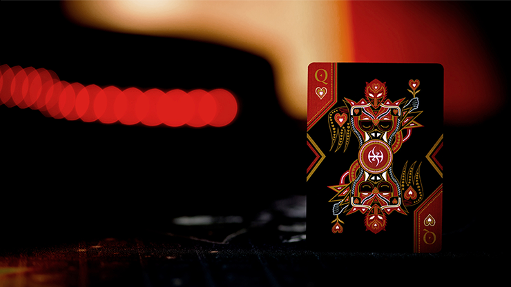 This HOT offering from De'vo has rare white and gold pips, and De'vo's signature Twin Tip mirror back design. De'vo's decks handle like no other and are WORLD CLASS! The fan patterns for both the back and the faces change depending on how they are manipulated. De'vo designed the backs and faces to make RED face fans! They are simply incredible! There is nothing else quite like this amazing deck of cards! These are PERFECT for card collectors, poker/game players, magicians and manipulators that want a beautiful and BOLD deck of playing cards! If you even remotely like playing cards, then you NEED this deck in your collection before they are gone forever!