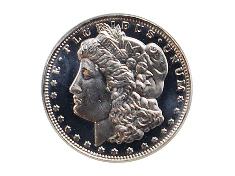 The obverse (front) is a recreation of the Morgan Dollar. It depicts a profile portrait representing Lady Liberty wearing a Phrygian cap with the motto “LIBERTY" inscribed in the headband. The reverse (back) depicts an eagle with wings outstretched.