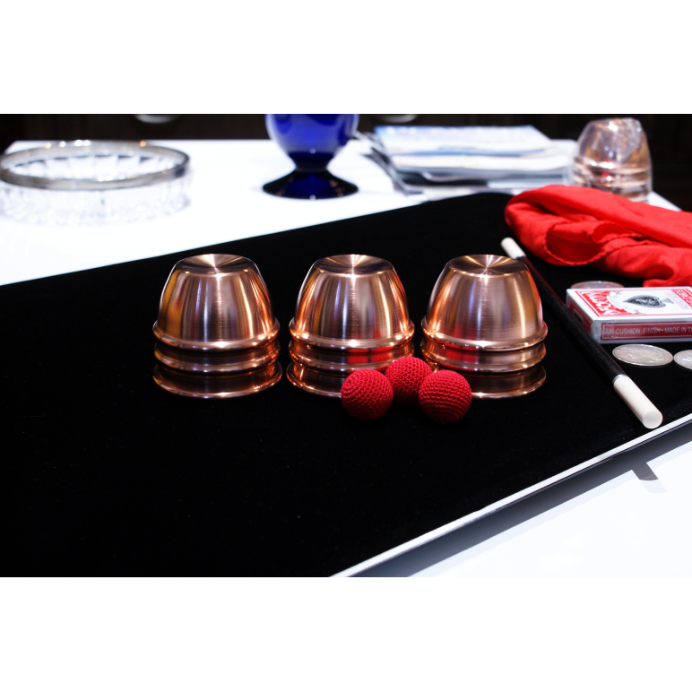 Each cup is hand spun from .064" copper with a brushed satin finish on their exterior. The interior is a satin copper finish. Each cup in the set weighs the same as each cup has an insert spun into it to mask any evidence of the gaff in the gaffed cup and balance the weight of the cups. You will not be able to determine which cup is gimmicked by look or feel alone.