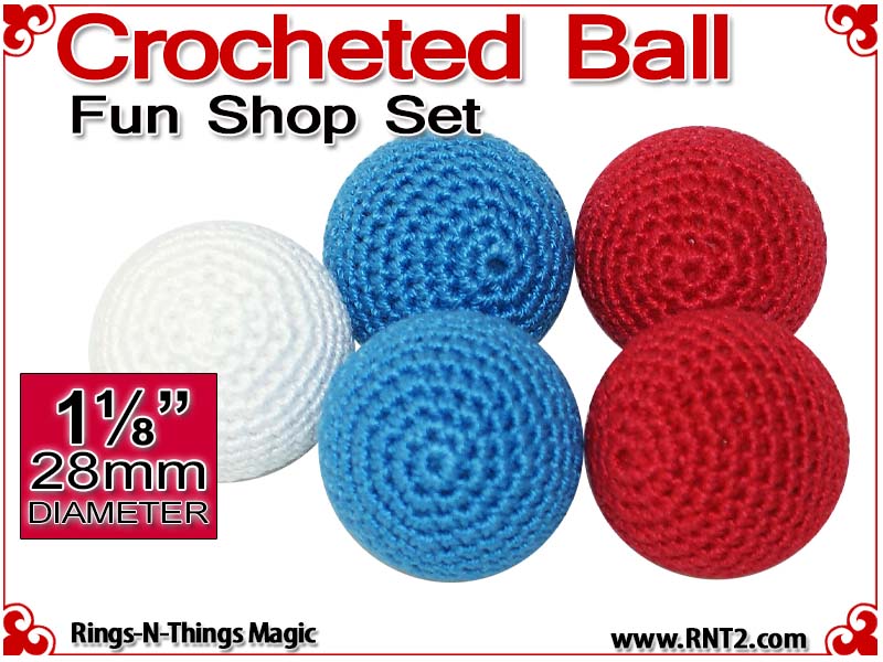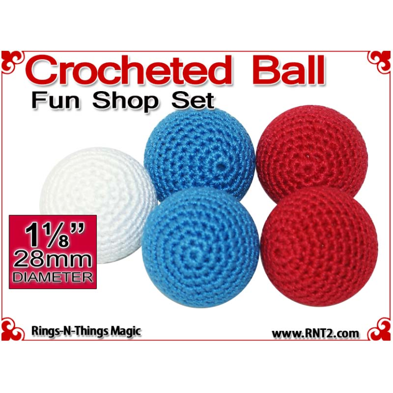 Each of our Crochet Balls is expertly crocheted by hand with the highest quality cotton/polyester thread over a painted hardwood core ball. Our hand-crocheted balls are preferred by most cups and balls performers for several reasons: