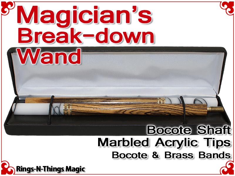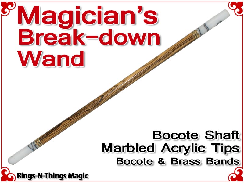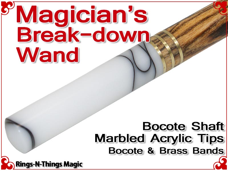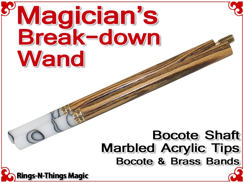 The Magicians Break-Down Wand is a stunning work of craftsmanship. Constructed from exotic hardwood Bocote with custom made Marbled Acrylic tips and brass rings, this wand is designed to be the best working wand in the world and built to last for years.