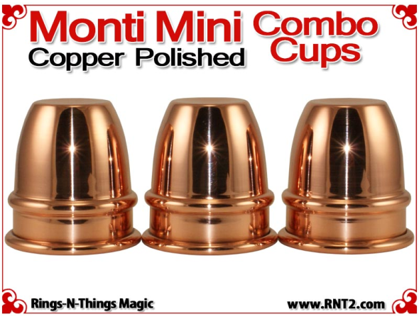 Monti Mini Combo Cups render the sleek look and feel of the original Harry Monti style of cups in a classic miniature design with a chopped cup included in the set. Weighing just 4.5 oz and a pint-sized height of just under 3 1/2" for a stack of three, these cups are light enough and small enough to travel with you effortlessly. However, their design allows you to perform strong professional cups and balls moves with them. The addition of the chopped cup opens up a variety of options for cups and balls routines with combo sets of cups.