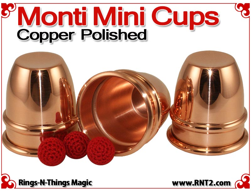 Monti Mini Cups render the sleek look and feel of the original Harry Monti style of cups in a classic miniature design. Weighing just 4.5 oz and a pint sized height of just under 3 1/2" for a stack of three, these cups are light enough and small enough to travel with you effortlessly. However, their design allows you to perform strong professional cups and balls moves with them.