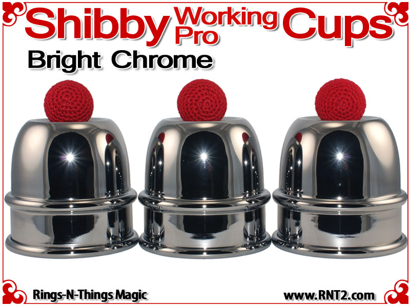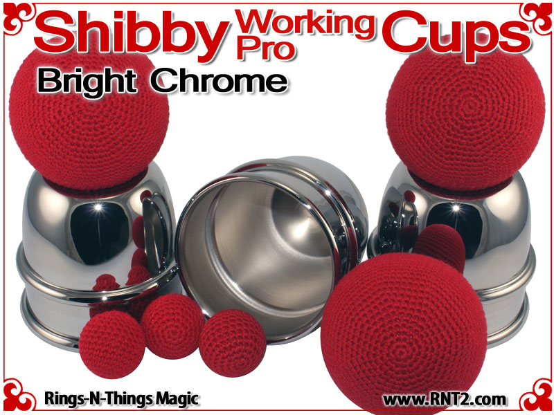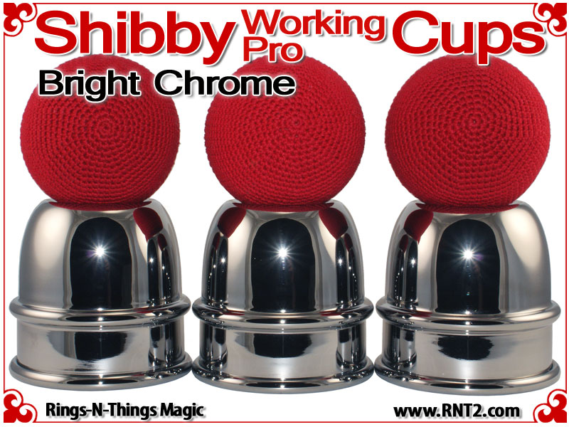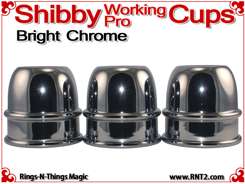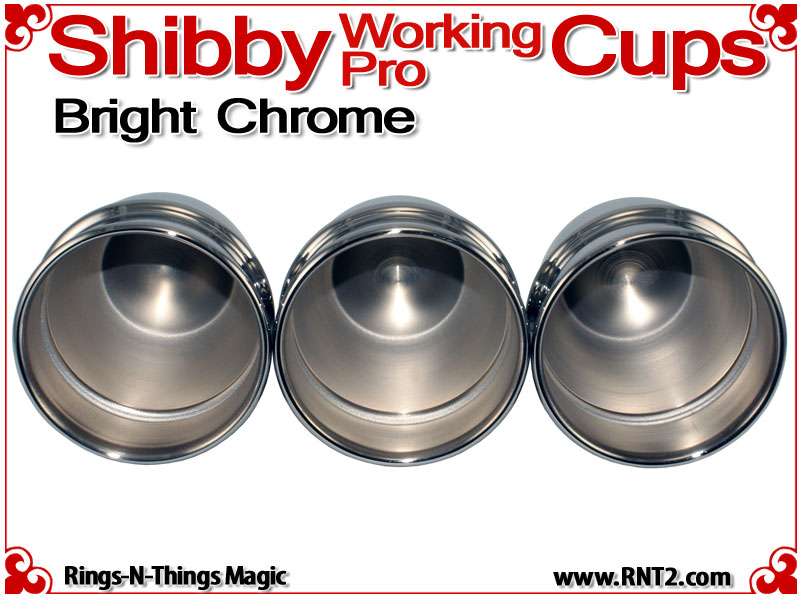 The Shibby Working Pro Cups are a modern 21st century cup for cups and balls accommodating all the modern needs of a 3 ball nest with 1 inch balls, a tennis ball load capacity and a deeply recessed dimple in the saddle. They are a single bead cup so they are not overtly ornamental. They are squatty in comparison to some other cups with the same capacity, but large enough to feel solid in the hand. For day in, day out performances, these are workers.